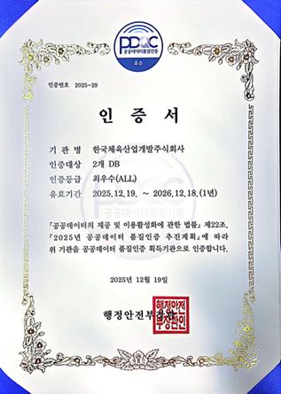 한국체육산업개발, 행안부 공공데이터 품질인증 2년 연속 ‘최우수’ 2025-12-29